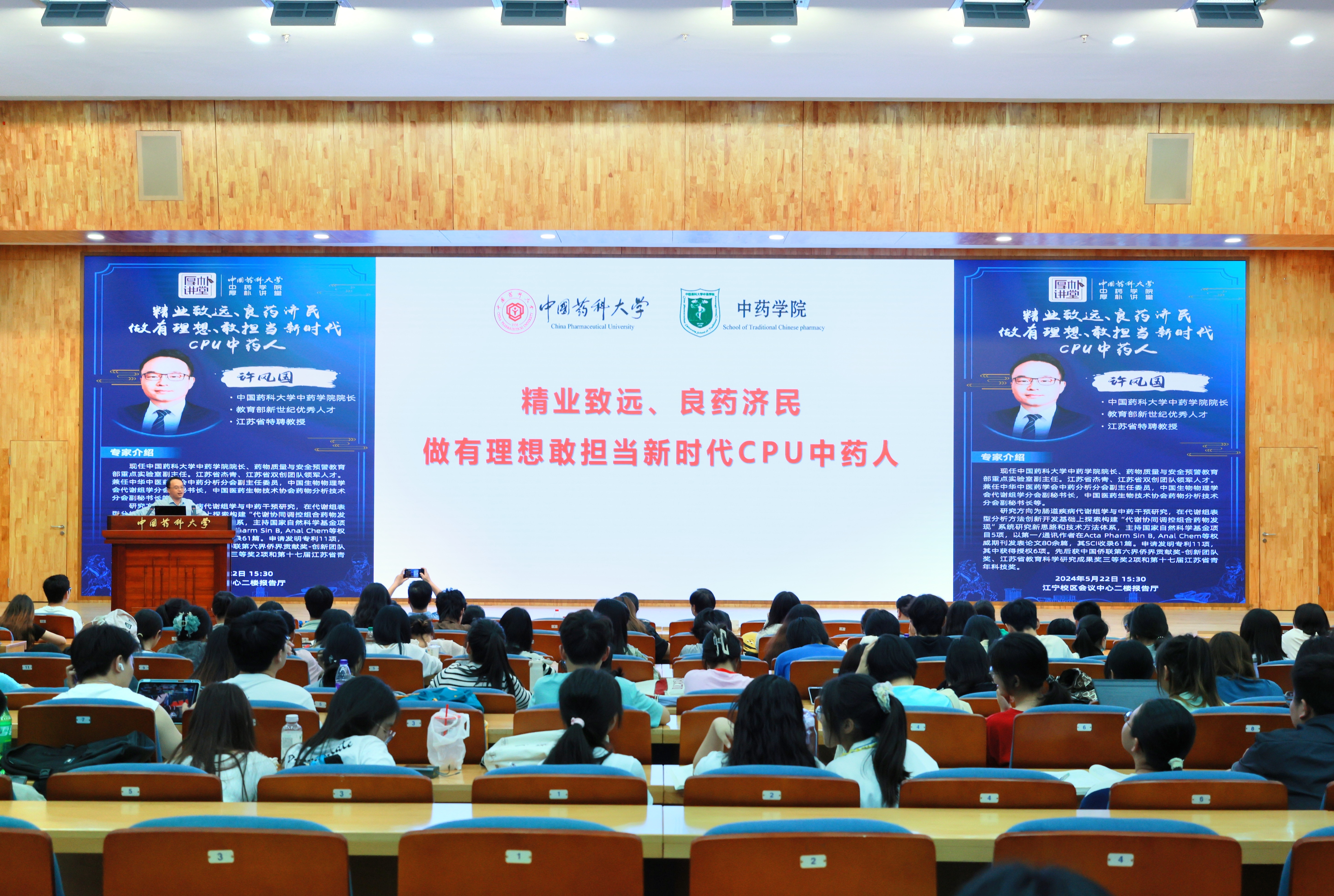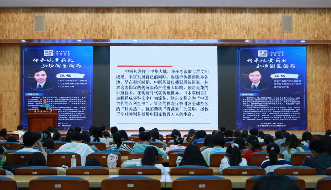 5月22日,竞彩比分 在江宁校区会议中心二楼报告厅举办“医药共鸣传薪火,互鉴相承筑未来”厚朴讲堂报告会。江苏省中医院主任中医师、江苏省名中医汪悦教授,我校竞彩比分 院长许风国教授应邀作专题报告。报告会由竞彩比分 党委副书记汪永生主持,竞彩比分 师生代表近300人参会。