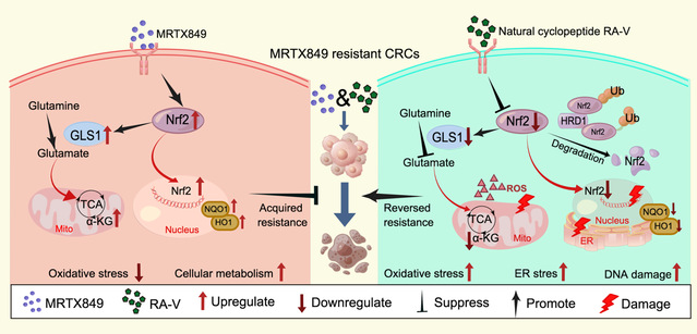 中药作为抗肿瘤的治疗或辅助手段受到了广泛关注,有效地提高了肿瘤患者的生活质量。大量证据表明天然产物对肿瘤具有高效的抗肿瘤作用,包括紫杉醇、喜树碱、长春碱、青蒿素等。RA-V是从小红参(Rubia yunnanensis)中分离得到的一种独特的天然环肽,是一个抗肿瘤候选分子。本研究旨在探讨RA-V是否可以逆转结直肠癌中MRTX849的耐药性,研究发现RA-V可以通过抑制Nrf2及其下游基因表达,从而有效地触发综合应激和DNA损伤应答。RA-V抑制Nrf2通路能够在MRTX849耐药的CRC中表现出更有效的抗肿瘤活性。这些发现为探索RA-V和MRTX849的联合用药治疗MRTX849耐药的晚期癌症奠定了基础。