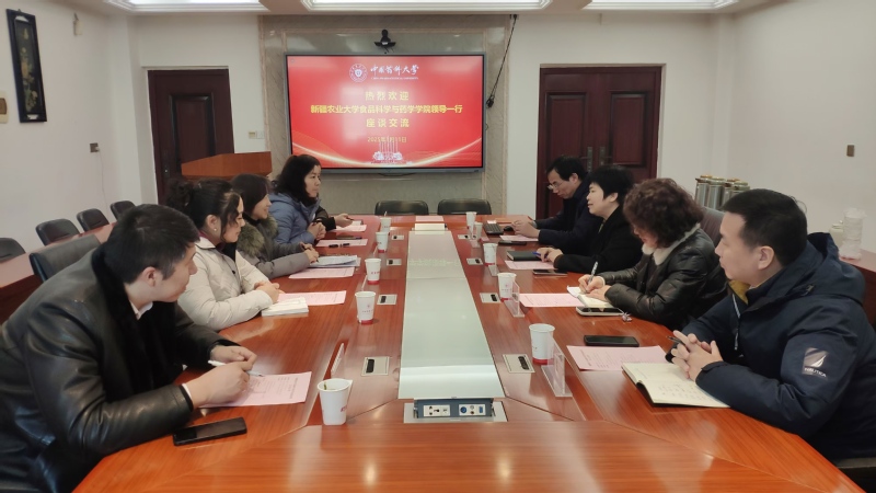 1月11日,新疆农业大学食品科学与药学学院党委书记姚剑英、院长杨晓君等一行来访竞彩比分 座谈交流。竞彩比分 党委书记赵健、副院长罗建光、副院长殷志琦、党委副书记汪永生等参加交流座谈,座谈会由赵健书记主持。