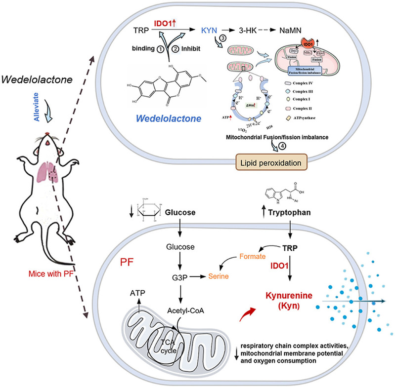 肺纤维化是一种高致死性呼吸系统疾病,临床治疗药物有限且副作用显著。团队前期发现IDO1在肺纤维化患者及动物模型中显著上调,并与胶原蛋白等纤维化标志物呈正相关。通过空间代谢组学、转录组学发现IDO1敲除小鼠可显著抑制肺成纤维细胞的增殖、分化、线粒体生物发生以及氧化磷酸化功能,从而减轻肺纤维化病理损伤。通过对小分子药物库的高通量筛选和结合验证发现,天然产物蟛蜞菊内酯(Wedelolactone, WEL)通过共价结合IDO1的K242位点,逆转线粒体功能障碍和脂代谢紊乱,显著改善小鼠肺纤维化病理表型,相同剂量下疗效与优于临床药物尼达尼布。该研究首次提出IDO1作为肺纤维化线粒体代谢调控枢纽,为靶向IDO1的药物开发提供全新策略。相关工作以“The crucial function of IDO1 in pulmonary fibrosis: From the perspective of mitochondrial fusion in lung fibroblasts and targeted molecular inhibition”为题发表于Acta Pharmaceutica Sinica B。博士研究生王磊为第一作者,中国药科大学张朝凤教授与南京鼓楼医院张楼乾主任为共同通讯作者,中国药科大学为第一通讯单位。