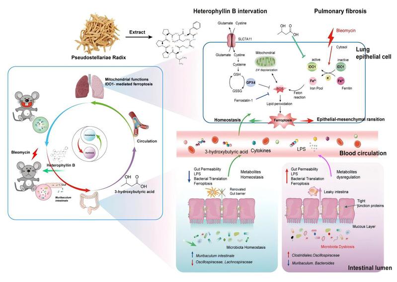 近期,该团队还聚焦于肠-肺轴多靶标天然产物的发现与机制研究,发现太子参环肽B(Heterophyllin B, HB)可通过调控肠道菌群Muribaculum intestinale及其代谢产物3-羟基丁酸(3-HA),抑制IDO1介导的铁死亡,从而缓解肺纤维化的新机制。研究通过多组学分析、基因敲除动物模型及临床样本验证,阐明IDO1通过积累Fe²⁺引发脂质过氧化和铁死亡,而HB通过重塑肠道微生态、促进3-HA生成,显著抑制IDO1活性并修复肺组织损伤。该研究为肺纤维化治疗提供了“肠-肺轴”调控新视角,并进一步推动靶向IDO1的天然药物研发。相关工作以“Murbaculum intestinale-derived 3-hydroxybutyric acid from Heterophyllin B attenuated pulmonary fibrosis through IDO1-mediated ferroptosis”为题发表于Pharmacological Research。博士研究生陈策为第一作者,中国药科大学张朝凤教授与日本东邦大学李巍教授为共同通讯作者,中国药科大学为第一通讯单位。