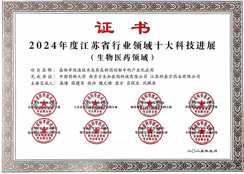 近日,“2024年度江苏省行业领域十大科技进展”评选结果发布,我校高缘/张建军团队联合南京方生和医药科技有限公司、江苏利泰尔药业有限公司完成的“晶体学改造技术及其在新药创制中的产业化应用”项目入选。