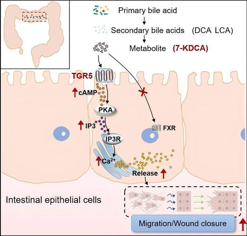 研究团队通过系统筛选发现,UC患者与结肠炎模型小鼠血清中多种胆汁酸水平显著降低,以7-酮脱氧胆酸(7-KDCA)的下调最为显著,且其含量与疾病严重程度呈负相关。在多种胆汁酸中,7-KDCA表现出最强的促黏膜修复作用,而外源性补充7-KDCA可显著加速DSS诱导与活检所致肠损伤模型小鼠的结肠黏膜愈合。机制研究表明,7-KDCA并非通过传统的抗炎免疫途径发挥作用,而是直接作用于肠上皮细胞,通过激活TGR5-IP3R信号轴,诱导内质网钙释放,从而增强上皮细胞的迁移能力,驱动伤口闭合,该发现为黏膜修复治疗提供了新靶点与理论依据。竞彩比分 博士研究生章静为本论文的第一作者,戴岳教授和夏玉凤教授为共同通讯作者。