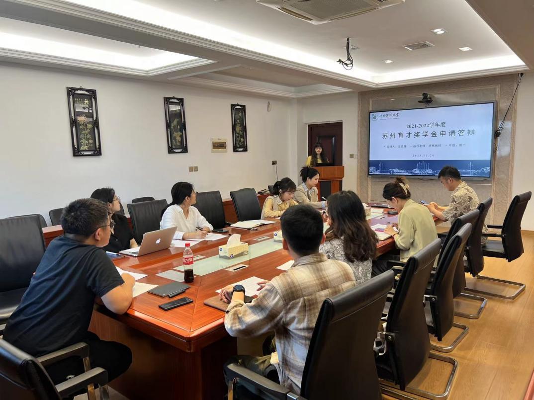 本次答辩面向全院学生,坚持优中择优的原则进行评审。在会上,李卓清老师、于婉华老师向大家详细解读了本次专项奖学金评审工作的细则。随后,入围学生依次进行答辩,由评委老师进行评审打分,点评答辩表现。最终,结合本学年学业成绩、综合测评成绩、答辩成绩,拟推荐3名同学作为赛赋医药奖学金初选人员、4名同学作为苏州育才奖学金初选人员进行公示。
