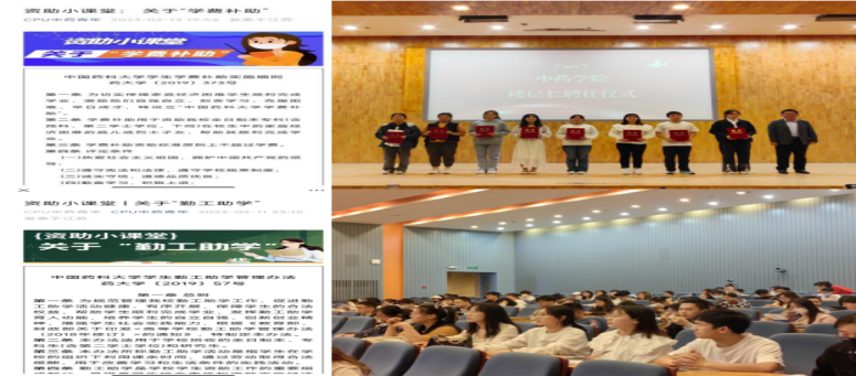 学院坚持打造特色平台,织就全方位、多角度、深层次、立体化的学生资助诚信教育网络。充分发挥新媒体宣传作用,扩大资助工作宣传范围,加大资助工作宣传力度,搭建资助知识课堂模块,向同学们普及国家资助政策,如中国药科大学资助管理工作实施办法、学费补助政策、勤工助学政策等。学院同步采取多种线下形式推进特色工作,举办“聚力强责,同寝同心”宿舍长大会,点对点、寝室对寝室、楼层对楼层分派学生进行自我管理、自我教育、自我服务,促进资助诚信教育主题活动开展。