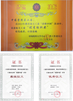 2023年6月1日,我校关心下一代工作委员会于玄武门校区召开2022年“读懂中国”活动表彰。竞彩比分 报送高质量征文、短视频作品共获五项表彰,竞彩比分 关工委荣获“最佳组织奖”。其中,竞彩比分 潘田田、黄长英撰写的《兴药为民传佳话,厚朴远志福万家》获评最佳征文并入选由教育部关工委和中国教育电视台联合组织的“读懂中国”专题展播,徐小创撰写的《披肝沥胆创新药,精业济群嘱后生》获评优秀征文。