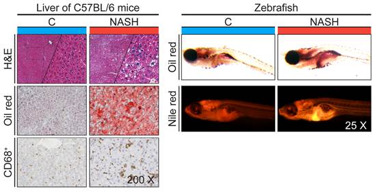 图6 A, 小鼠NASH模型;B, 斑马鱼NASH模型