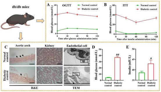 图7 自发2型糖尿病db/db小鼠.(A)口服葡萄糖耐量试验;(B)胰岛素耐量试验;(C)主动脉弓、肾脏的H&E染色和内皮细胞透射电镜观察;(D)空腹血糖水平;(E)血清胰岛素水平。Normal control:野生型C57BL/Ks小鼠;Diabetic control:db/db小鼠。