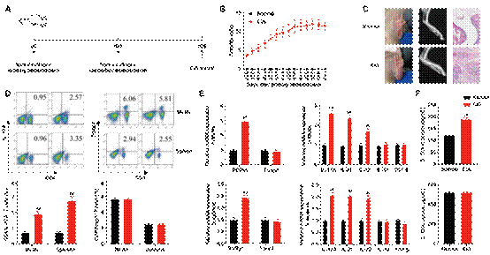 图1 Ⅱ型胶原诱导的小鼠关节炎模型.(A)模型建立.(B)关节炎指数.(C)关节病理学变化等.(D)脾脏和肠系膜淋巴结Th17或Treg细胞比例.(E)脾脏和肠系膜淋巴结Th17或Treg细胞相关因子水平.(F)血清IL-17A和IL-10水平.