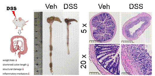 2. 构建葡聚糖硫酸钠(DSS)/三硝基苯磺酸(TNBS)诱导的大鼠或小鼠急慢性结肠炎模型,评价药物抗溃疡性结肠炎(图2)和克隆恩病的能力;