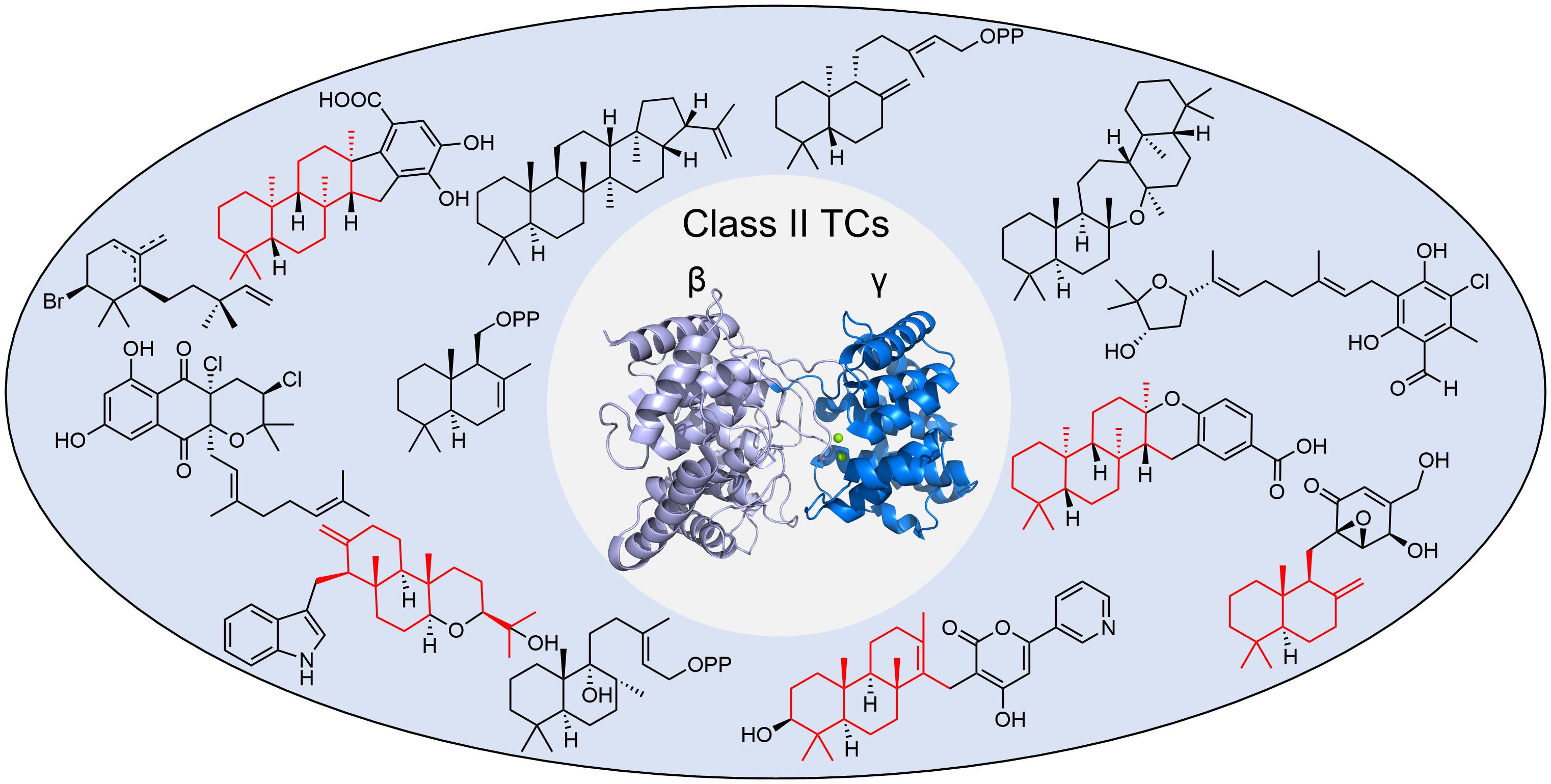 萜类化合物是自然界中结构最多样化的天然产物家族,广泛存在于各种生命形式中,发挥着举足轻重的作用。萜类化合物的生物合成涉及到I型与II型萜类环化酶,II型萜类环化酶利用其催化酸进行质子化启动环化,这一特性引起了有机化学家的广泛兴趣。基于结构的理性改造,该类酶可以高效催化自然界中最为复杂的环化反应。改造酶催化剂的前提需要对酶的蛋白质结构,催化空腔及其催化机制有前瞻性的理解,但目前学界尚无针对II型萜类环化酶的综合性评述。因此,该综述针对1997-2023年间报道的12个晶体结构,32例催化机制与11例代表性的工程化改造案例进行了系统的分析与总结,并重点结合此前的研究结果与最近董廖斌课题组发现的镁离子结合位点,首次系统且完整的呈现了II型萜类环化酶催化图景,为生物合成领域与有机化学领域的研究人员提供重要参考。